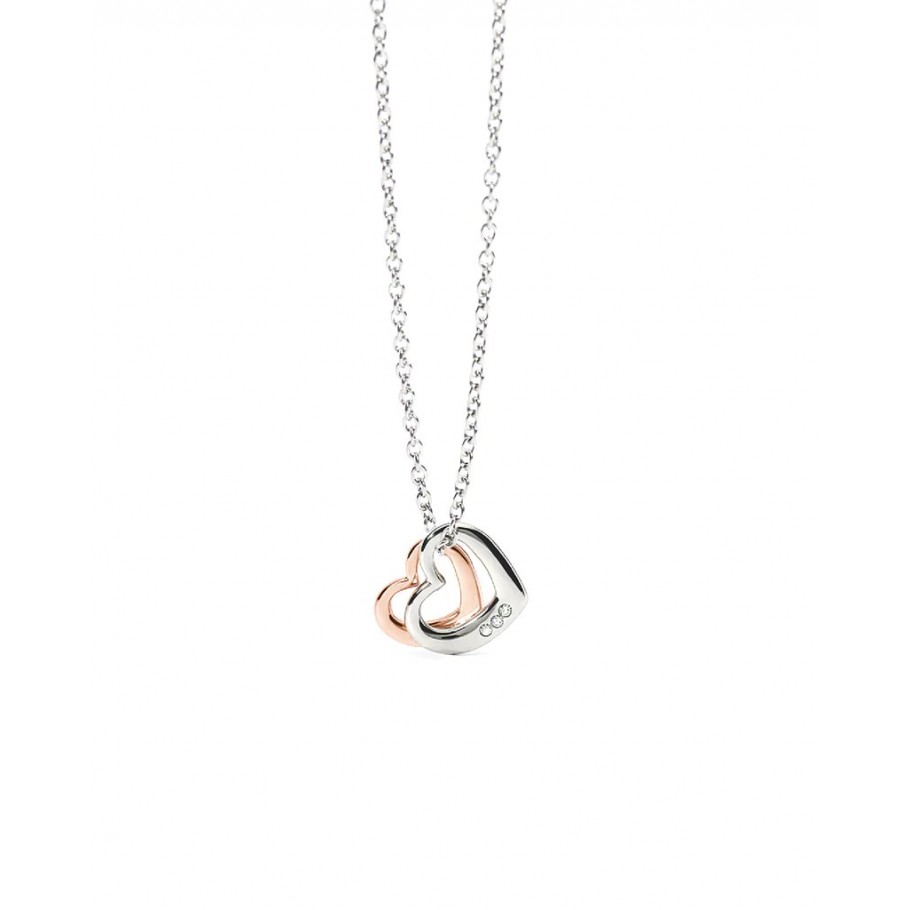 Ogrlica izrađena od nehrđajućeg čelika 316 L širine lanca 2 mm s privjescima u obliku malog srca u ružičastom PVD - u, 14x12,65 mm i veliko srce 16x14,20 mm, bijeli kristali Ø 1,50 mm te duljine 45 cm.