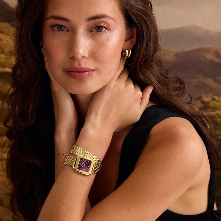 Ženski ručni sat CLUSE CW11910 iz kolekcije Gracieuse Petite predstavlja elegantan spoj minimalizma i sofisticiranosti, što ga čini idealnim izborom za žene koje preferiraju minimalistički, ali luksuzan stil prikladan za svakodnevno nošenje, kao i za svečane prilike. Kućište sata zlatne boje izrađeno je od nehrđajućeg čelika, što garantira izdržljivost i dugotrajnost, te ljubičaste boja brojčanika. Pokreće ga visokokvalitetan quartz mehanizam osiguravajući preciznost u svakom trenutku dok mu remen od nehrđajućeg čelika zlatne boje pruža istovremeno suptilni i elegantan izgled.