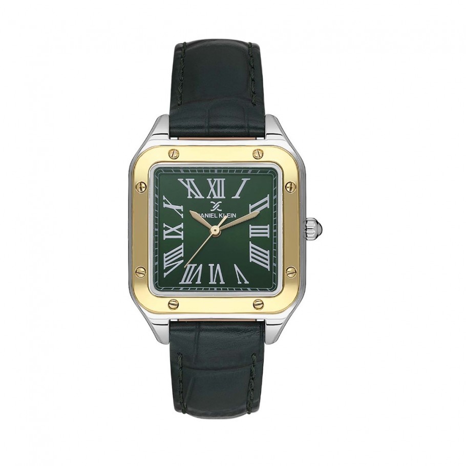 Ženski ručni sat DANIEL KLEIN DK.1.13599-3 s četvrtastim srebrno zlatnim kućištem. Sat je izrađen od metala brojčanika zelene boje. Centralna zlatna kazaljka za sat, minutu, sekundu Rimski brojevi kao pokazatelji sata i zeleni kožni remen daju posebnu notu ovom satu. Na brojčaniku istaknut logo DANIEL KLEIN Kućište sata širine je 27 mm dok ostale izvrsne karakteristike čine vodo otpornost do 30 m ( lagano prskanje, vlaga, znoj , pranje ruku. ) , vrijeme, minuta, sekunda Visokokvalitetni sat sa savršenim detaljima i preciznom završnom obradom. Ovaj elegantan sat idealan je izbor za svakodnevno nošenje ili posebne prigode.