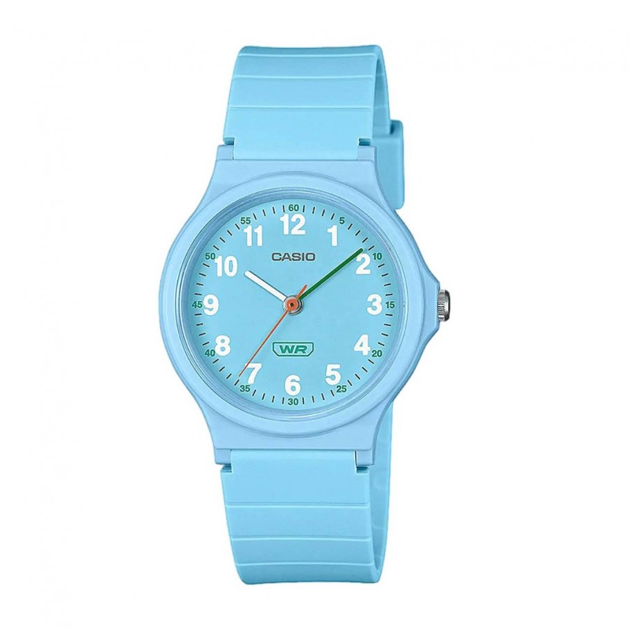 Ženski ručni sat CASIO LQ-24B-2BEF iz kolekcije POP. Elegantan i moderan retro model omogućava svakome da prepozna svoj dio sebe. Smola i plava boja remena s kopčom daju posebnu notu ovom satu i čine ga ugodnim za nošenje. Satom dominira plava boja kućišta te plava boja brojčanika. Sat pokreće quartz mehanizam. Dimenzije: 36,10 x  31,5  x  7,8 mm. Težina: okvirno 17 g